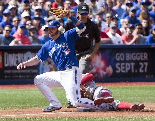 Josh Donaldson bobbles the ball after tagging Red Sox left fielder Brock Holt, who safely stole third base during Sunday’s game.Peter Power/The Canadian Press