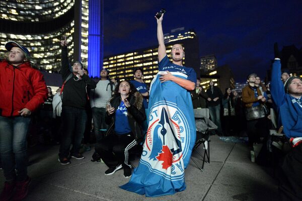 It was a sombre scene in Nathan Phillips Square when the clock tower of Toronto's Old City Hall struck six. The crowd gazed rapt but all but silent at the screen showing the final game of the Blue Jays' epic confrontation with the Texas Rangers. A single fan waved a rally towel limply above his head. Everyone else just stared, brows wrinkled, lips bitten. The whole city – no, the whole country – was on the edge of nervous collapse.