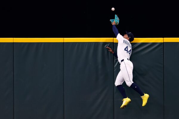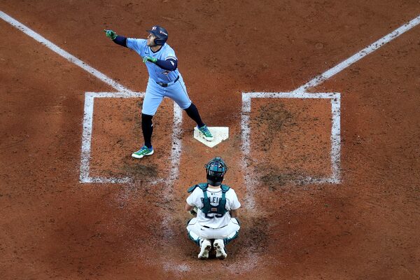 Julio RodrÃguez attempts to catch a home run hit by Guerrero Jr.Alika Jenner/Getty Images