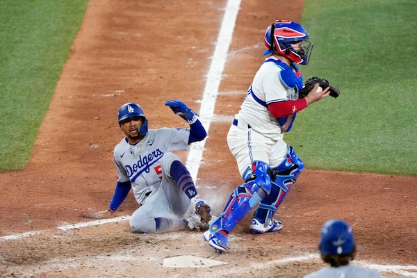 Isiah Kiner-Falefa is forced out at home plate by Will Smith during the ninth inning.Frank Gunn/The Canadian Press