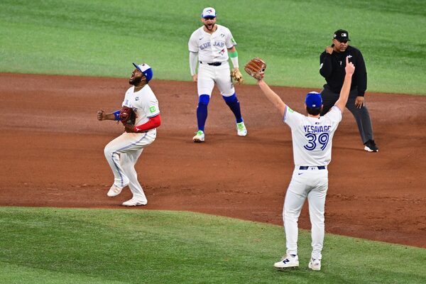 Vladimir Guerrero Jr., Bo Bichette and Trey Yesavage celebrate a double play to end the top of the seventh inning.Sammy Kogan/The Globe and Mail
