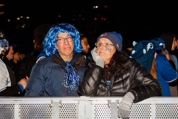 Blue Jays fans react to the Dodgers winning game seven of the World Series during a watch party at Nathan Philips Square.Duane Cole/The Globe and Mail