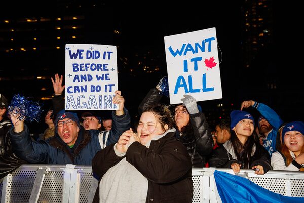 Blue Jays fans cheer during the Game 7 watch party at Nathan Philips Square.Duane Cole/The Globe and Mail