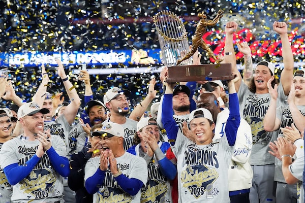 LA Dodgers pitcher Yoshinobu Yamamoto lifts the World Series MVP trophy as the team celebrates their win.Nathan Denette/The Canadian Press