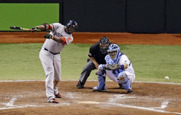 Boston Red Sox designated hitter David Ortizin, left, hits a single away from Tampa Bay Rays catcher Jose Molina in the fifth inning to drive in a run against the Tampa Bay Rays during Game 3 of an American League division series in St. Petersburg, Fla., Monday, Oct. 7, 2013.John Raoux/The Associated Press