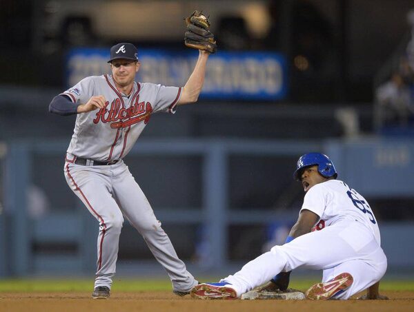 Los Angeles Dodgers' Yasiel Puig, right, looks for the call after being tagged out by Atlanta Braves second baseman Elliot Johnson, left, after Puig tried to steal second in the fourth inning of Game 4 in the National League division series Monday, Oct. 7, 2013, in Los Angeles.Mark J. Terrill/The Associated Press