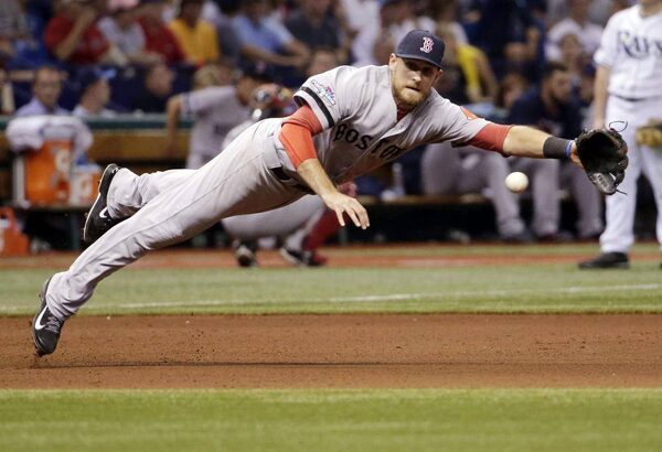 Boston Red Sox's third baseman Will Middlebrooks dives for the ball off a single by Tampa Bay Rays' Ben Zobrist in the seventh inning in Game 3 of an American League division series, Monday, Oct. 7, 2013, in St. Petersburg, FlaChris O'Meara/The Associated Press