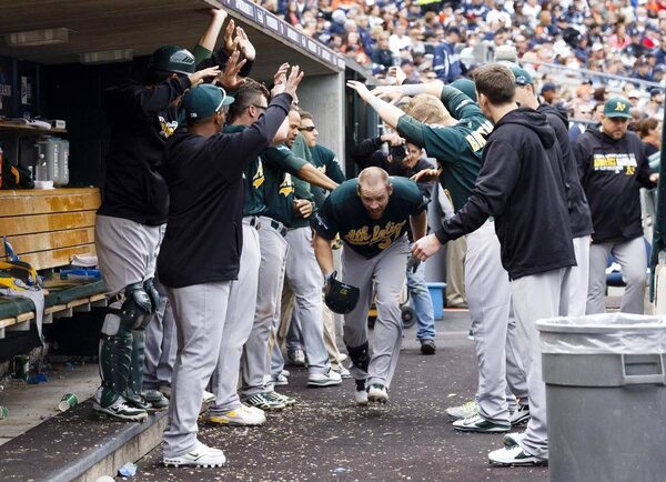 Oakland Athletics first baseman Brandon Moss (37) receives congratulations from teammates after hitting a solo home run in the fifth inning against the Detroit Tigers in Game 3 of the American League divisional series playoff game at Comerica Park.Rick Osentoski