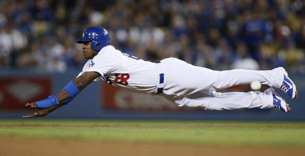 Los Angeles Dodgers' Yasiel Puig dives for second base before being caught stealing by a throw from Atlanta Braves catcher Brian McCann to second baseman Elliot Johnson, in the fourth inning of Game 4 in the National League division series Monday, Oct. 7, 2013, in Los Angeles.Danny Moloshok/The Associated Press
