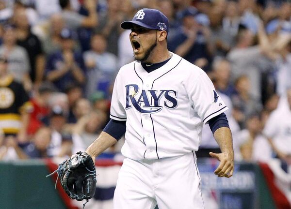 Tampa Bay Rays relief pitcher Alex Torres (54) reacts after recording the final out of the sixth inning against the Boston Red Sox in game three of the American League divisional series at Tropicana Field.Kim Klement
