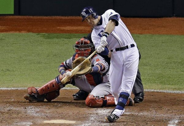 Tampa Bay Rays third baseman Evan Longoria, right, hits a three-run home run as Boston Red Sox catcher Jarrod Saltalamacchia watches in the fifth inning during Game 3 of an American League division series in St. Petersburg, Fla., Monday, Oct. 7, 2013.John Raoux/The Associated Press