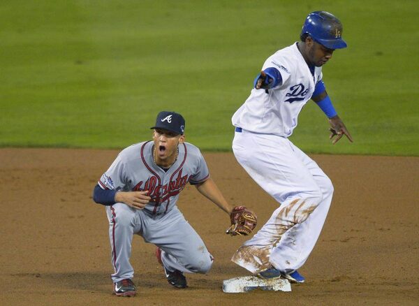 Los Angeles Dodgers' Hanley Ramirez stands on second after a steal as Atlanta Braves shortstop Andrelton Simmons reacts in the first inning of Game 4 in the National League division series Monday, Oct. 7, 2013, in Los Angeles.Mark J. Terrill/The Associated Press