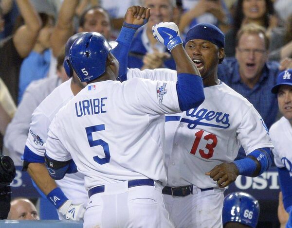 Los Angeles Dodgers' Juan Uribe (5) celebrates with Hanley Ramirez (13) after Uribe hit a two-run home run in the eighth inning of Game 4 in the National League division series Monday, Oct. 7, 2013, in Los Angeles. The Dodgers won 4-3.Mark J. Terrill/The Associated Press