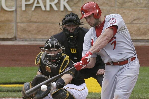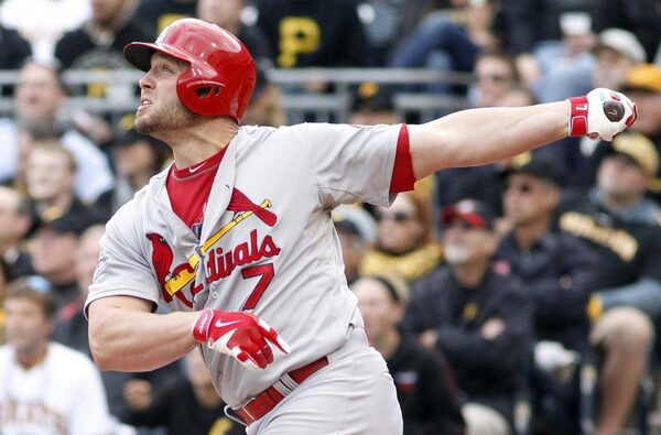 St. Louis Cardinals left fielder Matt Holliday (7) hits a two run home run against the Pittsburgh Pirates during the sixth inning in game four of the National League divisional series at PNC Park.Charles LeClaire