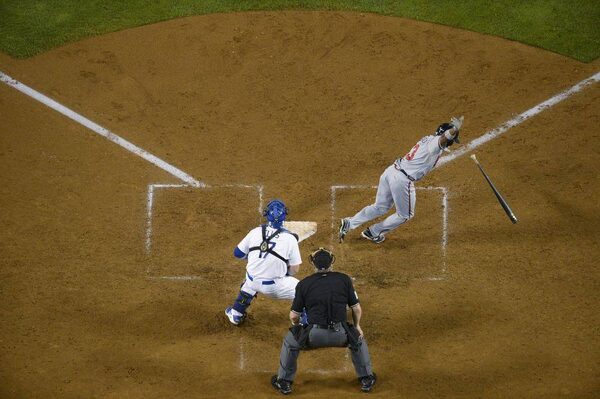 Atlanta Braves' Jose Constanza, right, tosses his bat after hitting a single in the seventh inning to score Elliot Johnson, as Los Angeles Dodgers catcher A.J. Ellis and home plate umpire Bill Miller stand behind the plate, in Game 4 of the National League division series Monday, Oct. 7, 2013, in Los Angeles.Mark J. Terrill/The Associated Press