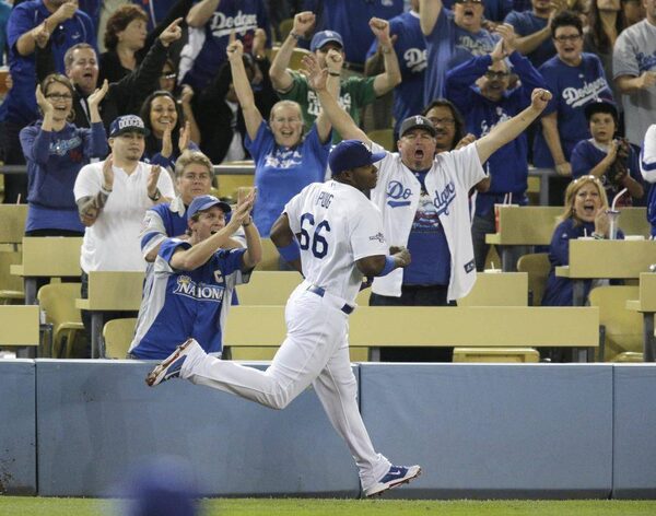 Fans cheer after Los Angeles Dodgers right fielder Yasiel Puig caught a line drive hit by Atlanta Braves' Justin Upton in the third inning of Game 4 in the National League division series Monday, Oct. 7, 2013, in Los Angeles.Jae C. Hong/The Associated Press
