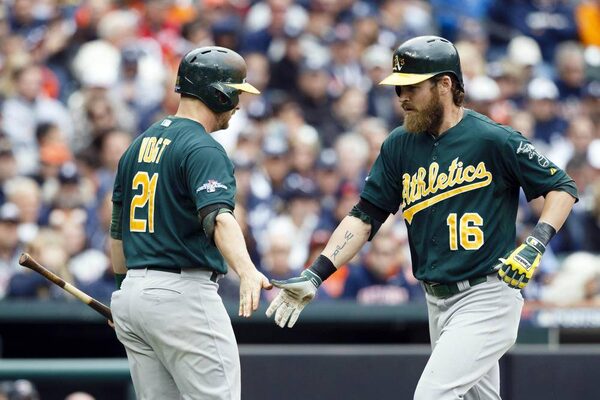 Oakland Athletics catcher Stephen Vogt (21) congratulates right fielder Josh Reddick (16) after Reddick hit a solo home run in the fourth inning against the Detroit Tigers in Game 3 of the American League divisional series playoff game at Comerica Park.Rick Osentoski