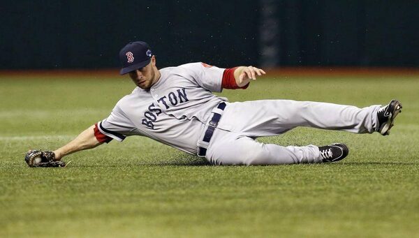 Boston Red Sox left fielder Daniel Nava catches a fly ball from Tampa Bay Rays' Matt Joyce in the second inning in Game 3 of an American League division series, Monday, Oct. 7, 2013, in St. Petersburg, Fla.Mike Carlson/The Associated Press