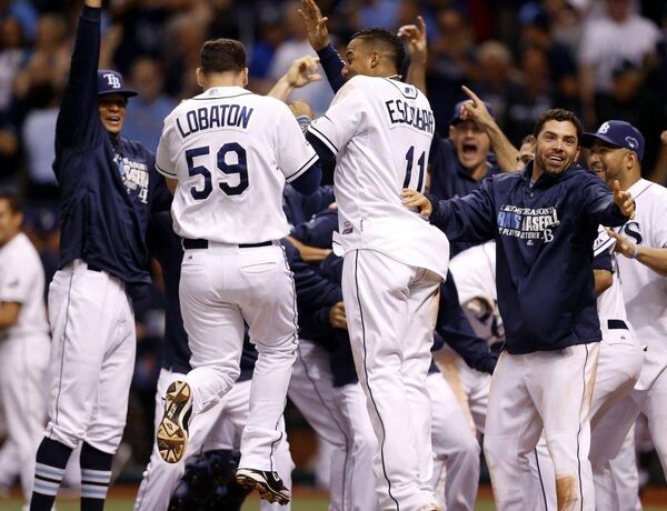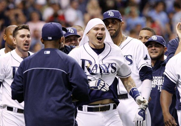 Tampa Bay Rays catcher Jose Lobaton (middle) celebrates with teammates after hitting a walk off solo home run during the ninth inning against the Boston Red Sox in game three of the American League divisional series at Tropicana Field. The Rays won 5-4.Kim Klement