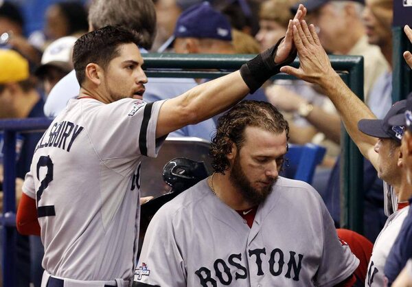 Boston Red Sox's Jacoby Ellsbury, left, is congratulated after scoring a run in the first inning in Game 3 of an American League division series against the Tampa Bay Rays, Monday, Oct. 7, 2013, in St. Petersburg, Fla.Mike Carlson/The Associated Press