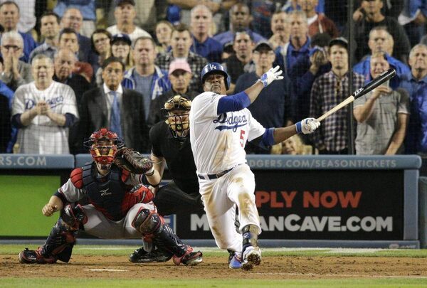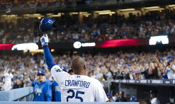 Los Angeles Dodgers' Carl Crawford tips his cap to cheering fans after he hit a solo home run in the third inning of Game 4 in the National League division series against the Atlanta Braves, Monday, Oct. 7, 2013, in Los Angeles. It was Crawford's second home run of the game.Danny Moloshok/The Associated Press