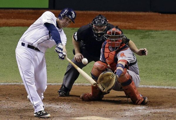Tampa Bay Rays' Jose Lobaton hits a home run in front of Boston Red Sox catcher Jarrod Saltalamacchia in the ninth inning to win Game 3 of an American League division series in St. Petersburg, Fla., Monday, Oct. 7, 2013.John Raoux/The Associated Press