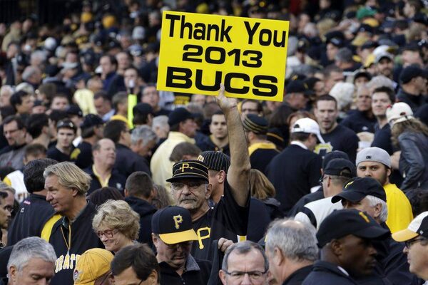 A Pittsburgh Pirates fan holds a sign at the end of a 2-1 loss to the St. Louis Cardinals in Game 4 of a National League division baseball series on Monday, Oct. 7, 2013 in Pittsburgh.Gene J. Puskar/The Associated Press
