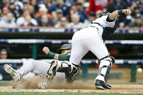 Oakland Athletics catcher Stephen Vogt (left) scores a run as Detroit Tigers catcher Alex Avila (13) reaches for the ball in the fourth inning in Game 3 of the American League divisional series playoff game at Comerica Park.Rick Osentoski