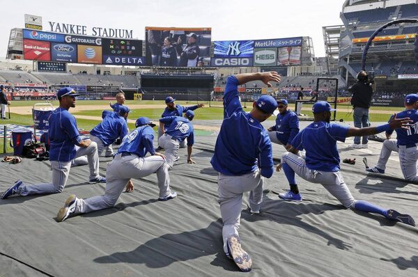 Toronto Blue Jays players stretch on a tarp on the field before their game against the New York Yankees.Kathy Willens/The Associated Press