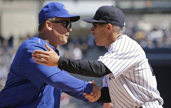 Toronto Blue Jays manager John Gibbons, left, greets New York Yankees manager Joe Girardi before a game in New York, Monday, April 6, 2015.Kathy Willens/The Associated Press