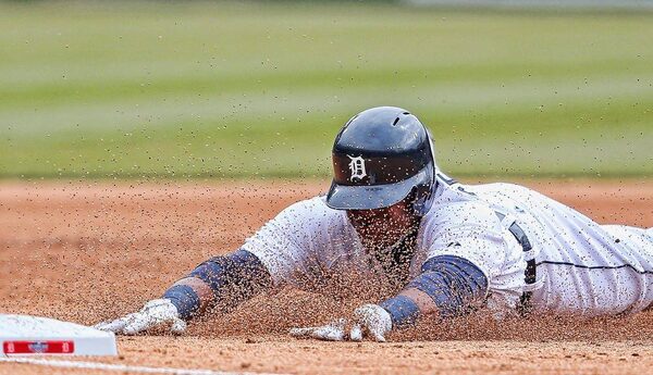 Yoenis Cespedes of the Detroit Tigers slides into third base for a triple during the sixth inning of a game against the Minnesota Twins at Comerica Park on April 6, 2015 in Detroit.Leon Halip/Getty Images