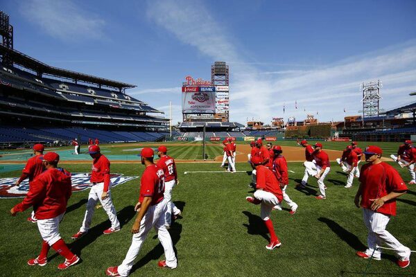 Members of the Philadelphia Phillies stretch ahead of an opening day baseball game against Boston Red Sox on Monday, April 6, 2015, in Philadelphia.Matt Rourke/The Associated Press