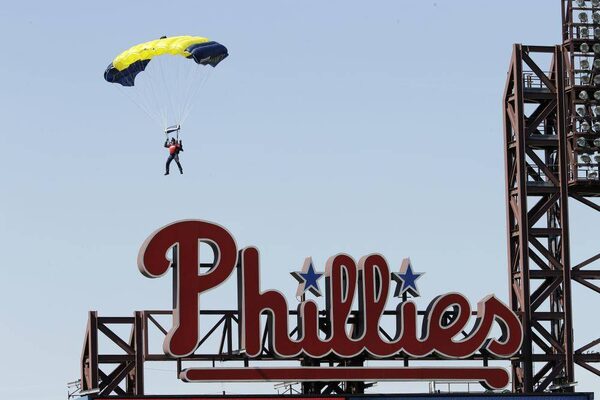 A member of the U.S. Navy parachute demonstration team, the Leap Frogs, jumps into the stadium before an opening day baseball game between the Philadelphia Phillies and the Boston Red Sox Monday, April 6, 2015, in Philadelphia.Matt Rourke/The Associated Press