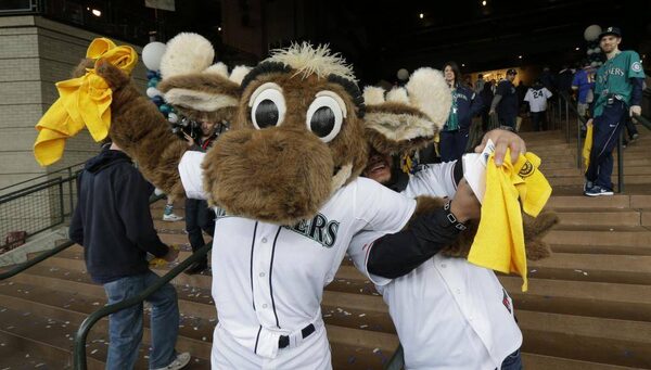 Moose, the Seattle Mariners mascot, playfully blocks the view of a Los Angeles Angels fan trying to take a selfie cell phone photo with him after gates opened for an opening day baseball game between the Seattle Mariners and the Los Angeles Angels, Monday, April 6, 2015, in Seattle.Ted S. Warren/The Associated Press