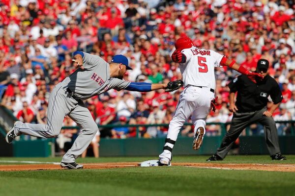 Yunel Escobar of the Washington Nationals beats out the throw as first baseman Lucas Duda of the New York Mets applies the late tag in the first inning during Opening Day at Nationals Park on April 6, 2015 in Washington, DC.Rob Carr/Getty Images