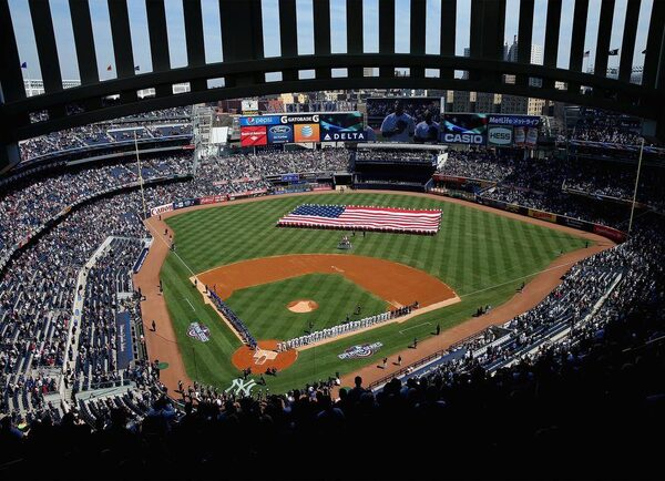 The New York Yankees and Toronto Blue Jays line up for the national anthems before Opening Day on April 6, 2015 at Yankee Stadium in the Bronx.Elsa/Getty Images