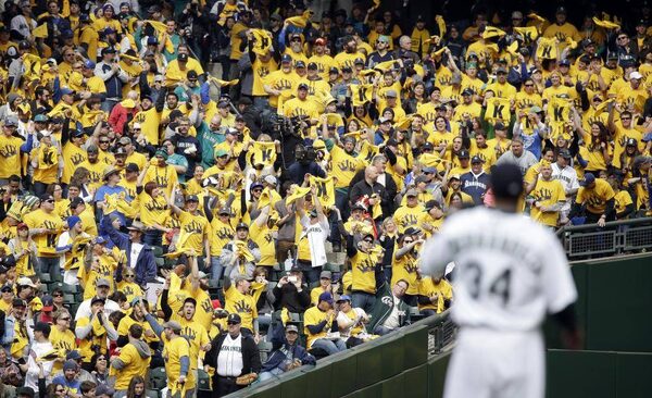 Seattle Mariners' fans seated in the "King's Court" cheer starting pitcher Felix Hernandez on his first strikeout, of Los Angeles Angels lead off hitter Kole Calhoun in the first inning of a baseball game Monday, April 6, 2015, in Seattle.Elaine Thompson/The Associated Press