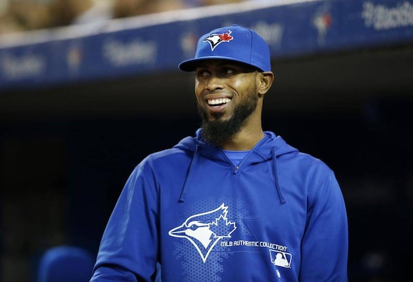 Injured Toronto Blue Jays player Jose Reyes smiles as his team plays the Tampa Bay Rays in their American League baseball game in Toronto, May 22, 2013.MARK BLINCH/Reuters