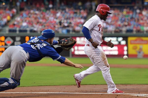 Russell Martin of the Toronto Blue Jays loses the ball trying to tag Odubel Herrera of the Phillies in the first inning in Philadelphia on Wednesday night.Drew Hallowell/Getty Images