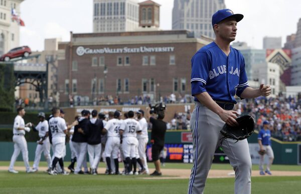 Toronto Blue Jays relief pitcher Lucas Harrell walks off the field as the Detroit Tigers celebrate their win on July 16, 2017.Carlos Osorio/The Associated Press