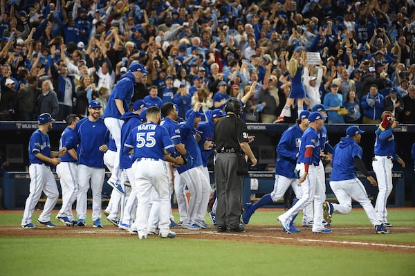 Edwin Encarnacion hit a three run home run in the bottom of the 11th to give the Blue Jays a 5-2 win. Toronto will play Texas in the ALDS. Game one is Thursday at 1:30pm.Fred Lum/The Globe and Mail