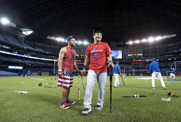 Texas Rangers’ Rougned Odor, left, and Shin-Soo Choo laugh while walking through the Toronto Blue Jays on-field team workout at Rogers Centre on Oct. 7.Darren Calabrese/The Canadian Press