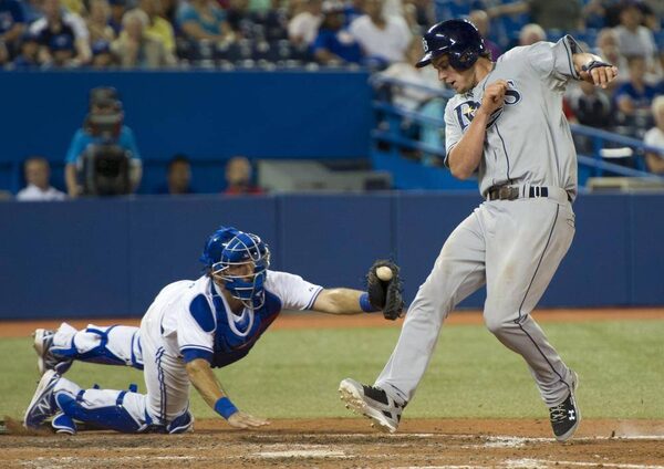 Tampa Bay Rays Will Myers eludes the tag of Toronto Blue Jays catcher J.P. Arencibia to score during ninth inning AL action Toronto on Friday July 19, 2013.Frank Gunn/The Canadian Press