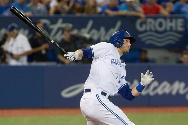 Toronto Blue Jays left fielder Michael Saunders watches his solo home run off Los Angeles Angels relief pitcher A.J. Achter during eighth inning Major League baseball action in Toronto on Tuesday, August 23, 2016.The Canadian Press