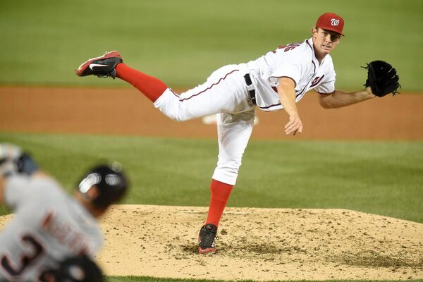 The Washington Nationals’ Stephen Strasburg pitches during the sixth inning of Monday’s game against the Detroit Tigers in Washington.Mitchell Layton/Getty Images
