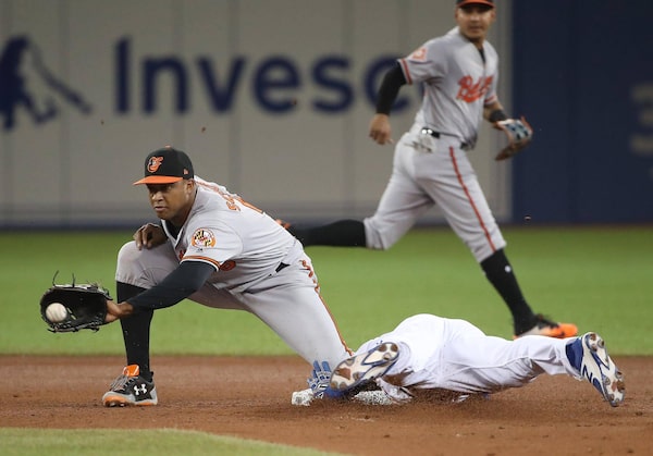 The Jays’ Ezequiel Carrera steals second base as the Orioles’ Jonathan Schoop reaches for the throw during their matchup at Rogers Centre on Thursday.Tom Szczerbowski/Getty Images