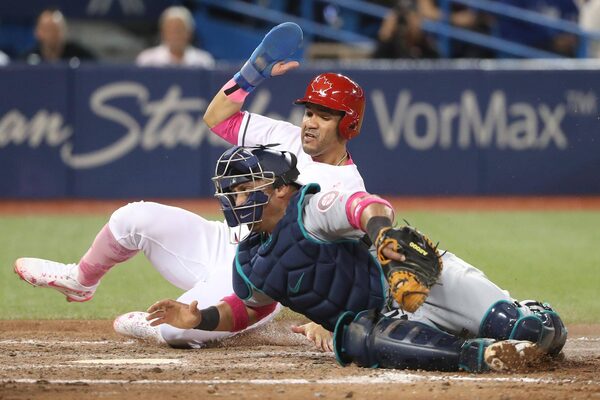 Devon Travis of the Toronto Blue Jays steals home plate as Carlos Ruiz of the Seattle Mariners tries to tag him at Rogers Centre on May 13, 2017 in Toronto. Players are wearing pink to celebrate Mother's Day weekend and support breast cancer awareness.Tom Szczerbowski/Getty Images