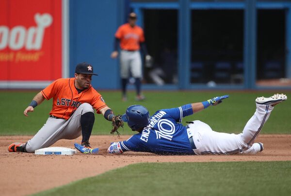 The Blue Jays’ Edwin Encarnacion slides into second past the Houston Astros’ Jose Altuve at Rogers Centre on Sunday.Tom Szczerbowski/Getty Images
