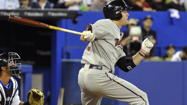 Minnesota Twins batter Justin Morneau watches a fly ball out against the Toronto Blue Jays during the first inning of their MLB American League baseball game in Toronto April 1, 2011. REUTERS/ Mike CasseseMIKE CASSESE/Reuters