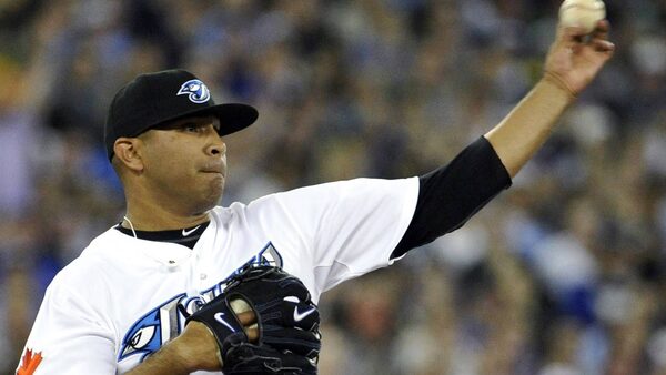 Toronto Blue Jays starting pitcher Ricky Romero throw the first pitch of the season to Minnesota Twins centre fielder Denard Span during first inning AL action in Toronto on Friday, April 1, 2011. THE CANADIAN PRESS/Frank GunnFrank Gunn/The Canadian Press